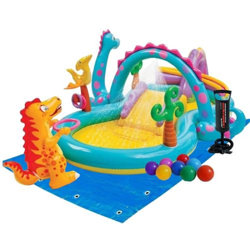 Надувний виріб «Надувний ігровий центр Intex 57135-2 "Планета динозаврів", 333 х 229 х 112 см, з кульками 10 шт, підстилкою, насосом» створений для веселих літніх розваг і комфортного релаксу.
