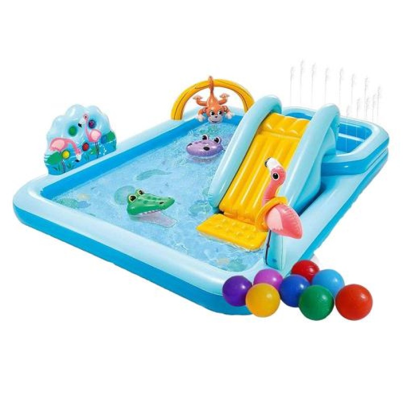 «Надувний ігровий центр Intex 57161-1 «Пригоди джунглів», 244 x 198 x 71 см, з кульками 15 шт.» — яскравий аксесуар для відпочинку на воді та біля басейну.