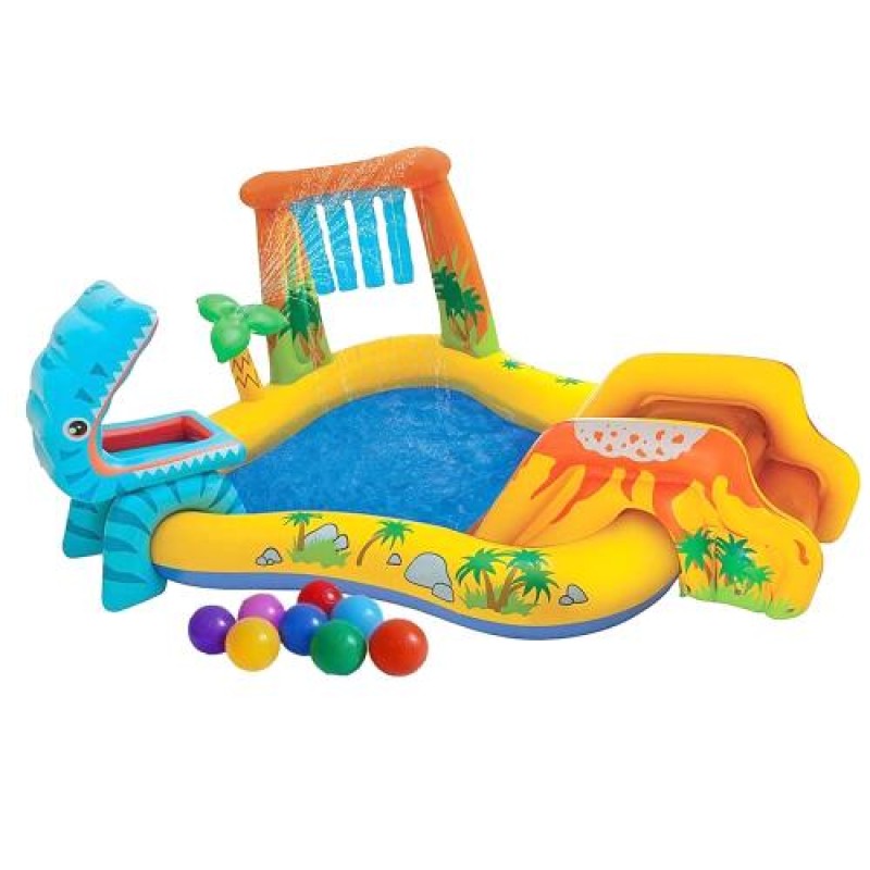 «Надувний ігровий центр Intex 57444-1 «Динозаври», 249 х 191 х 109 см, з кульками 16 шт.» — яскравий аксесуар для відпочинку на воді та біля басейну.