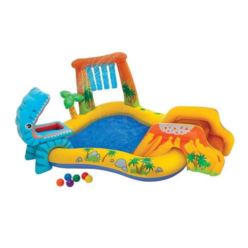 «Надувний ігровий центр Intex 57444 «Динозаври», 249 х 191 х 109 см, з гіркою для спуску, фонтаном та кульками 6 шт.» допоможе зробити відпочинок на пляжі або біля басейну ще приємнішим.