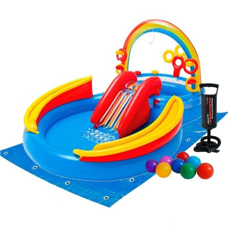 «Надувний ігровий центр Intex 57453-2 «Райдуга», 297 х 193 х 135 см, з кульками 16 шт, підстилкою, насосом» — яскравий аксесуар для відпочинку на воді та біля басейну.