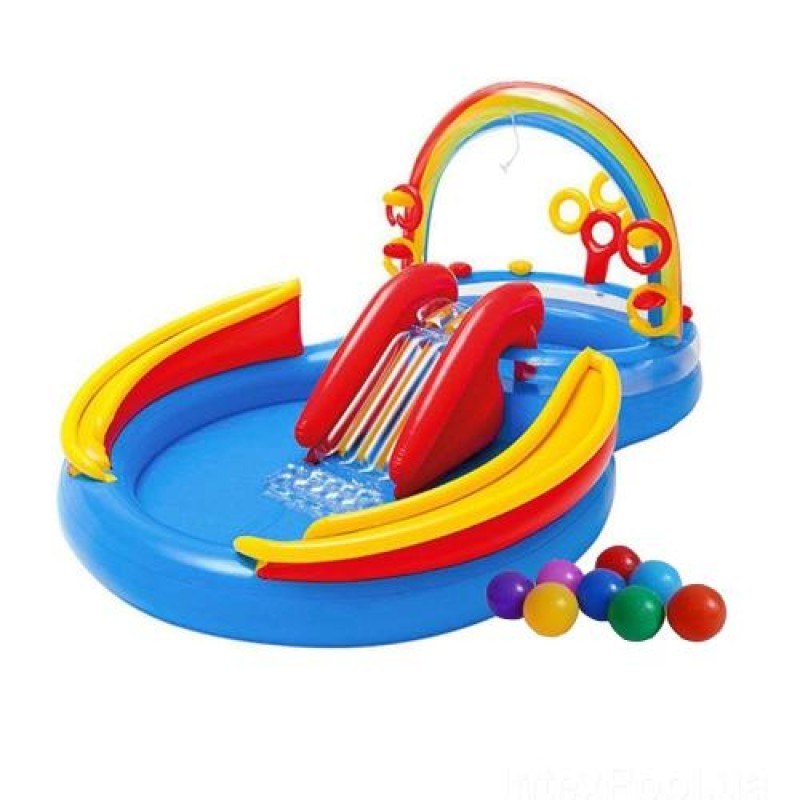 «Надувний ігровий центр Intex 57453 «Райдуга», 297 х 193 х 135 см, з надувними кільцями, фонтаном та гіркою» — яскравий аксесуар для відпочинку на воді та біля басейну.