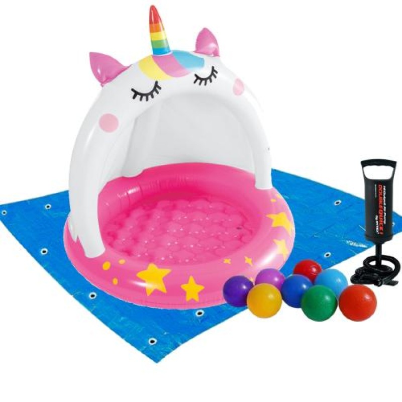 Дитячий надувний басейн Intex 58438-2 «Єдиноріг» з навісом, 102 х 102 см, з кульками 10 шт, підстилкою, насосом