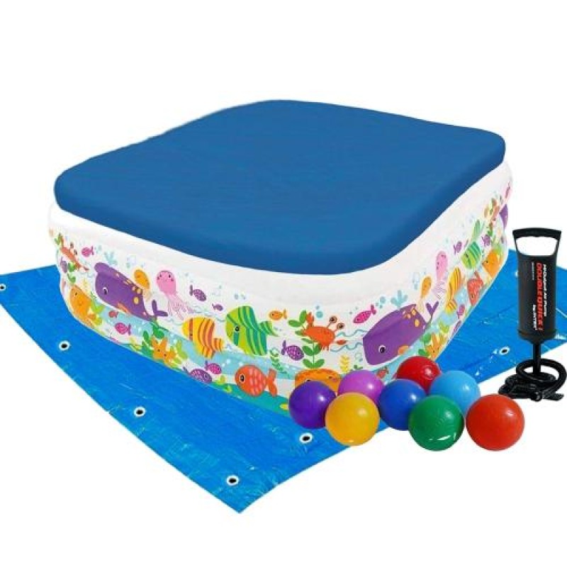 Надувний виріб «Дитячий надувний басейн Intex 57471-3 «Акваріум», 159 х 159 х 50 см, з кульками 10 шт, тентом, підстилкою, насосом» створений для веселих літніх розваг і комфортного релаксу.