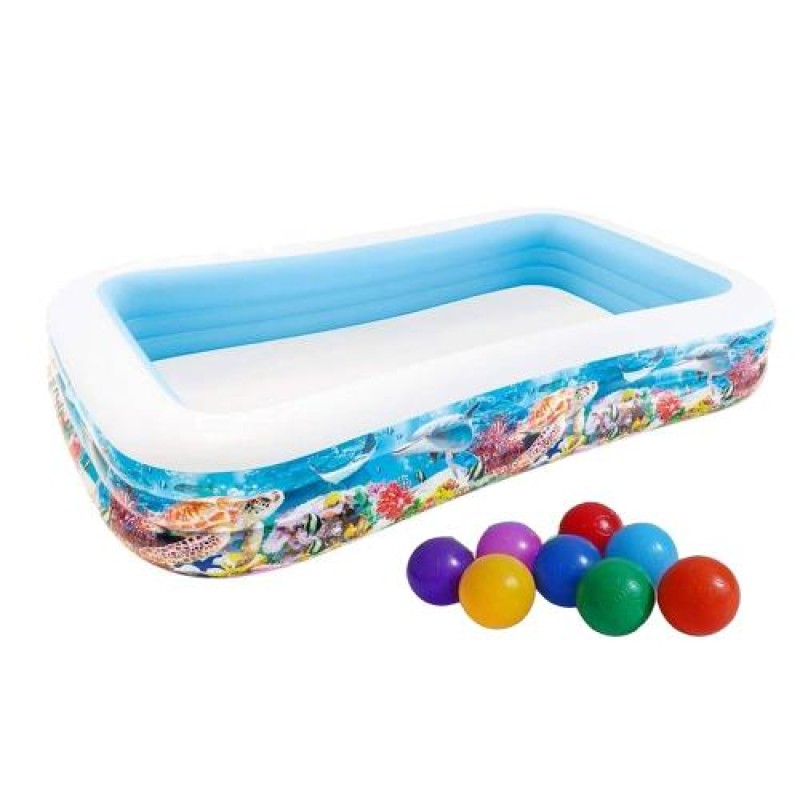 «Дитячий надувний басейн Intex 58485-1 «Тропічний риф», 305 х 183 х 56 см, з кульками 10 шт» — яскравий аксесуар для відпочинку на воді та біля басейну.