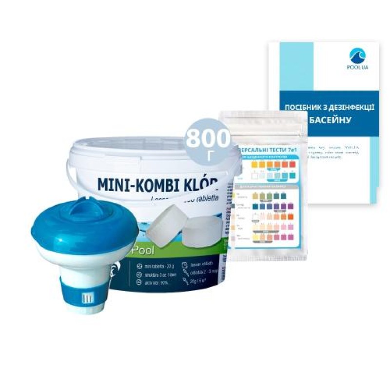 Набір для щоденної дезінфекції «Аква Догляд» InPool 80021 (MINI хлор 800 г, MINI поплавець, тести). Засоби для об'єму 1÷3 м³, 3÷5 м³