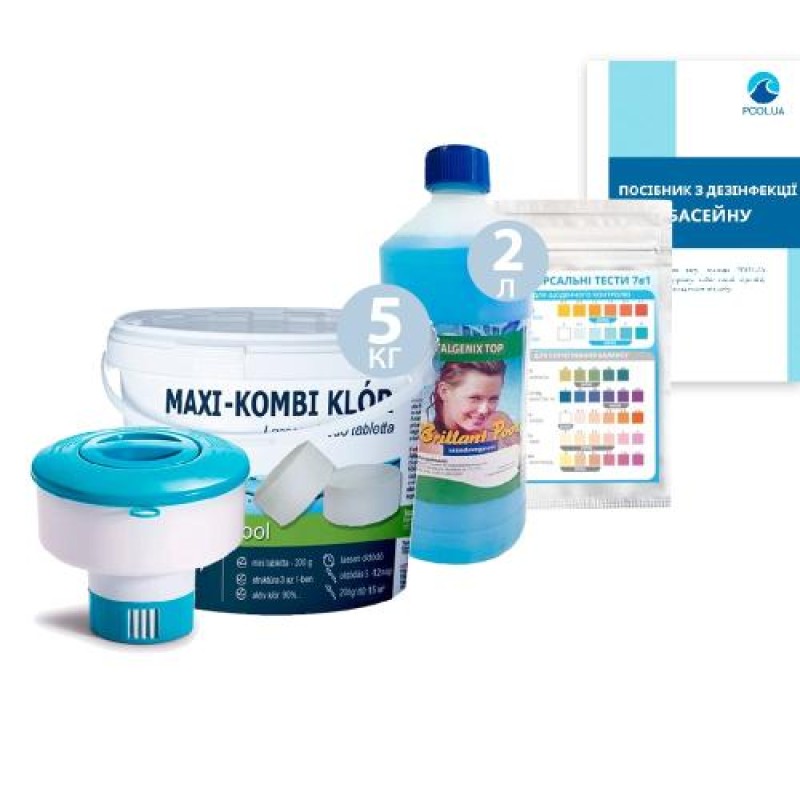 Набір для щоденної дезінфекції «Аква Догляд» InPool 80527 (MAX хлор 5 кг, MAX поплавець, альгекс ТОП 2 л, тести). Засоби для об'єму 13 ÷ 27 м³