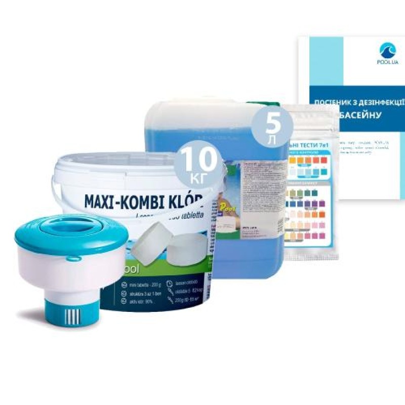 «Набір для щоденної дезінфекції «Аква Догляд» InPool 80555 (MAX хлор 10 кг, MAX поплавець, альгекс ТОП 5 л, тести). Засоби для об'єму 40 ÷ 55 м³» — практичне рішення для регулярного обслуговування басейну.