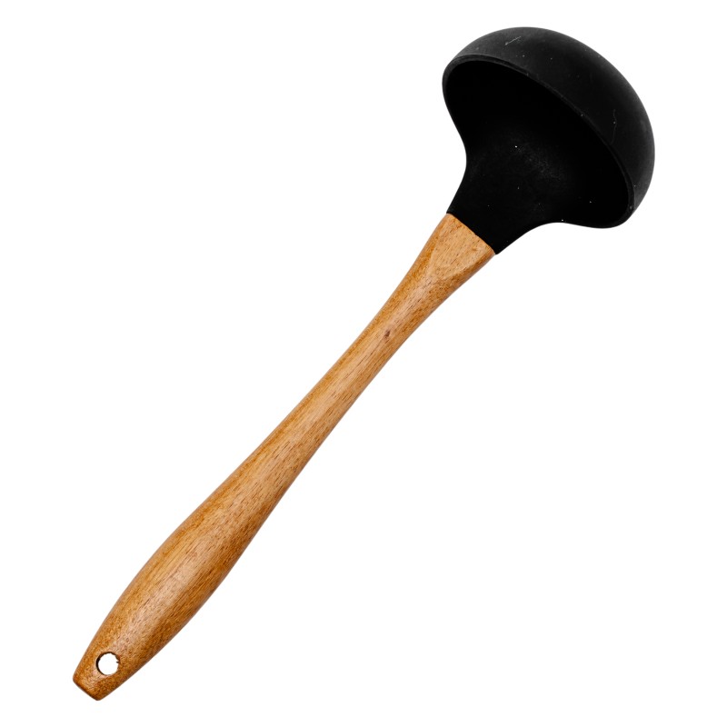 Кухонний ополоник – незамінний аксесуар для подачі перших страв, рагу, напоїв, а також для роботи з рідким тестом. Половник виготовлений із харчового силікону, витримує досить високі температури та не дряпає посуд. Це дозволяє використовувати його зі скляними каструлями, каструлями з антипригарним покриттям та іншим посудом, який легко пошкодити. Аксесуар має довгу дерев'яну ручку, яка не нагрівається та виключає можливість обпектися.