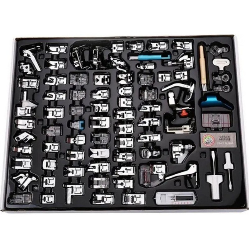 У набір входять 82 різних преси для різних цілей, у тому числі прес для оздоблювальних рядків з лінійкою, універсальний прес, відкритий металевий прес для аплікації, а також преси для вшивання блискавки та шнура. Притиск для ґудзикових стібків; притиск для потайних стібків із прозорого пластику; прозорий притиск для аплікації; притиск для шиття бісером, намистинами та товстими шнурами; універсальний притиск для оверлока; притиск для атласних стібків; притиск для стібків з раковиною зі сферичним жолобком та вузьким носиком 6 мм; притиск для зигзагу з рухомим дном; прозорий відкритий притиск для аплікації; відкритий металевий притиск (ширший притиск, ніж прозорий), притиск для пришивання до 3 шнурів або декоративних ниток, притиск для печворка, притиск для тасьми, стрічок, паєток і гумок, притиск зигзаг для складного декору, притиск для прямої рядки для тонкої тканини керований притиск для печворка 1/4” (6,4 мм), притиск для обрізання краю зі стопором; притиск для шиття на 5 шнурів; притиск для шиття на 7 шнурів або декоративних ниток; притиск для обрізання краю; притиск для обрізання краю; притиск для блискавки; притиск для бахроми та букле (об'ємний декор), притиск для обрізання краю з прорізом (з регульованою функцією), збирання Золото, притиск для підшивки 3 мм, притиск для підшивки 6 мм, притиск для підшивки 3 мм сферичних жолобків; притискання для валиків, притискання для бісеру, паєток і шнура, притискання для петель, притискання для штопки, квілтингу та вишивки монограм, притискання для потайних стібків, притискання для квілтингу, Блискавки, Преси для вшивання шнура (ниток), Преси для трикотажу тонких тканин, Преси для 7-голкового рядка, Преси для 9-голкового рядка, інші.